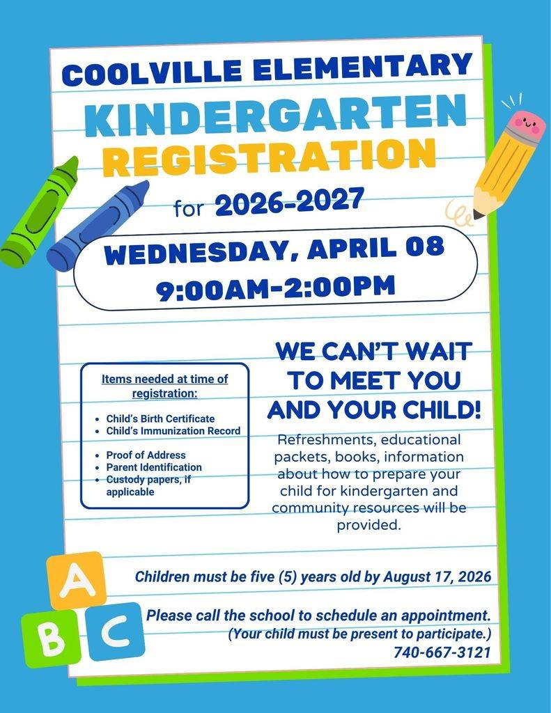 COOLVILLE, Ohio – Reminder for Coolville families! Preschool and Kindergarten Registration for the 2026-2027 school year is coming up.