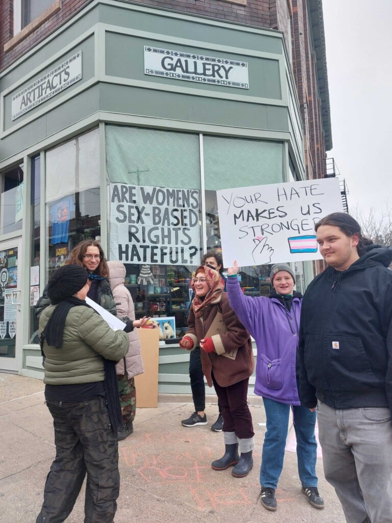 The protest came after Artifacts owner Amy Mangano made several statements and posted signs in her shop windows that object to trans people — in particular trans women — gaining more rights and visibility. Several statements have been attributed to Mangano labeling trans women as “predatory.” Many of her Twitter interactions are with accounts that claim trans women are “grooming” children, a common right-wing conspiracy theory.