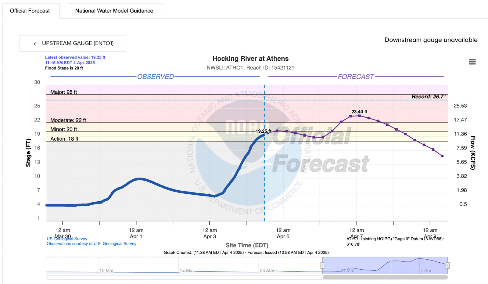 - To get a sense of possible future impacts, check the forecast at the Hocking River gauge in Athens from the National Water Prediction Service, updated frequently.