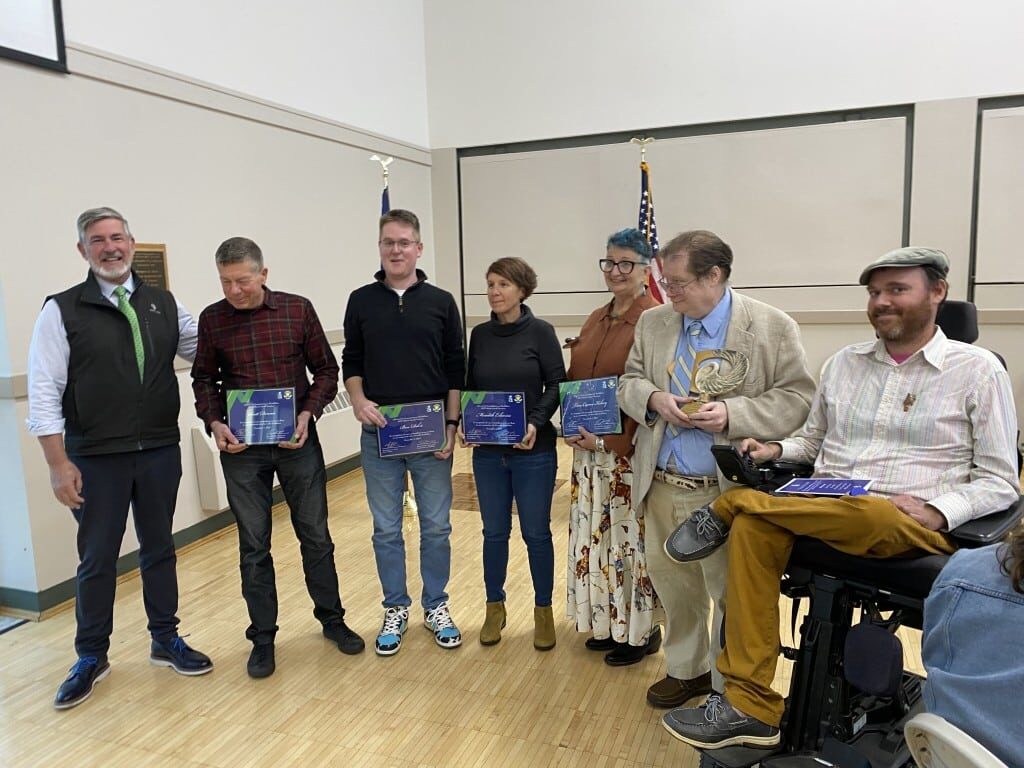 Athens Mayor Steve Patterson and Athens City Commission on Disabilities Chairperson Davey McNelly, pictured with the 2023 Athena Award nominees. Left to right: Patterson, Scott Dennis, Ben Dikis, Meredith Erlewine, Tina Cernes Kelsey, William “Billy” Peacock, McNelly. Photo by Dani Kington.