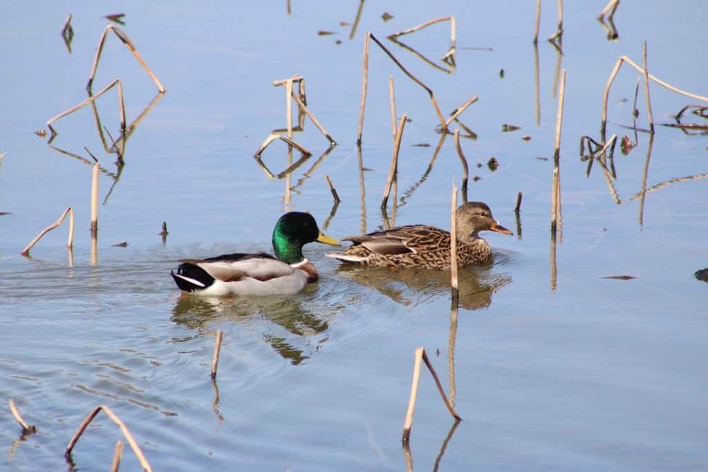 A particularly common duck species found year-round across Ohio. Populations exist across most of North America and Eurasia. Seen more often than not in any area of water, raucously chattering and quacking. Females quack and males do not. Mallards are social ducks that favor flocking together, often intermixing with other species. Males have a distinctive green head, yellow bill, mocha chest and light gray body. Females and juveniles are brown and mottled with an orange bill. Both sexes have a dark blue patch on their wings in flight.