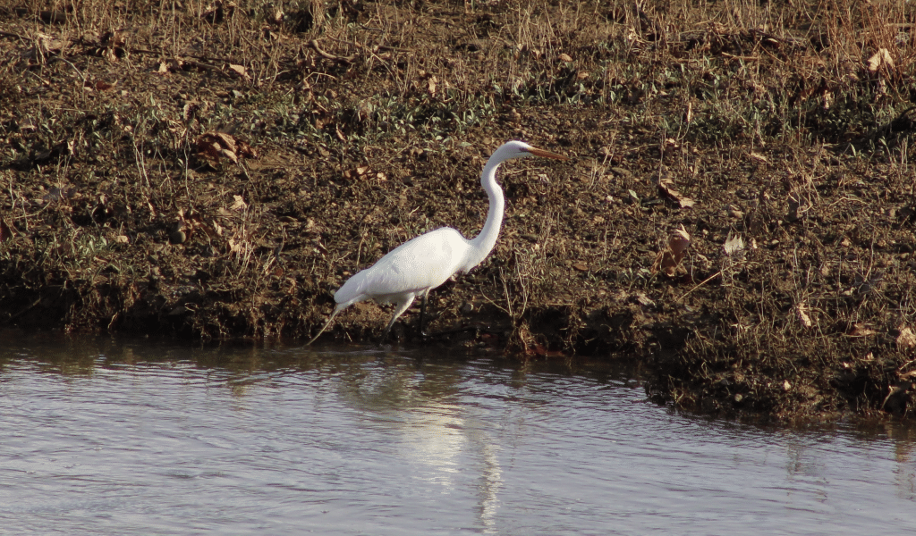 A large, white wading bird with a neck curved like an ‘S’. Great Egrets have a sharp yellow bill, which they use to jab into the water to hunt their prey. Distinguishable from the all-white Great Blue Heron by its black legs. Breeding adults have flashy plumes of feathers that are used in courtship displays during the spring and summer. Nearly hunted to extinction in the nineteenth century for the feathers to be used for fashion. Today, they can be found across Ohio during migration and on every continent except for Antarctica.