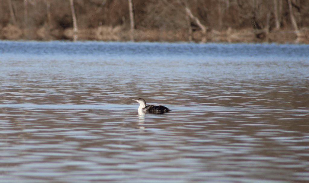 A rather small migratory waterbird species that is excellent at hunting. Breeding adults have a slate gray head, rusty throat patch and dark back. Nonbreeding adults have a dark-capped head and a white face and neck. Both adult forms have a distinguishable upward-turned bill. Red-Throated Loons primarily spend the winter along saltwater coasts and in the Great Lakes region but sometimes show up on large bodies of water inland.