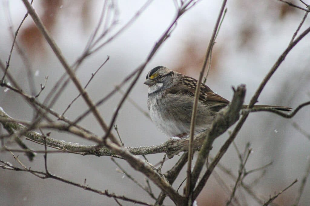 A wintering passerine species found almost entirely across the 48 continental states. Populations arrive in the state around mid-fall and migrate north near the end of spring. Adults have a distinguishable plain white throat, yellow eye patch and black streaks on their crown and head. White-Throated Sparrows can be seen in large number below feeders foraging for seeds by kicking up leaves and grass. Large numbers also congregate in dense thickets and shrubbery.