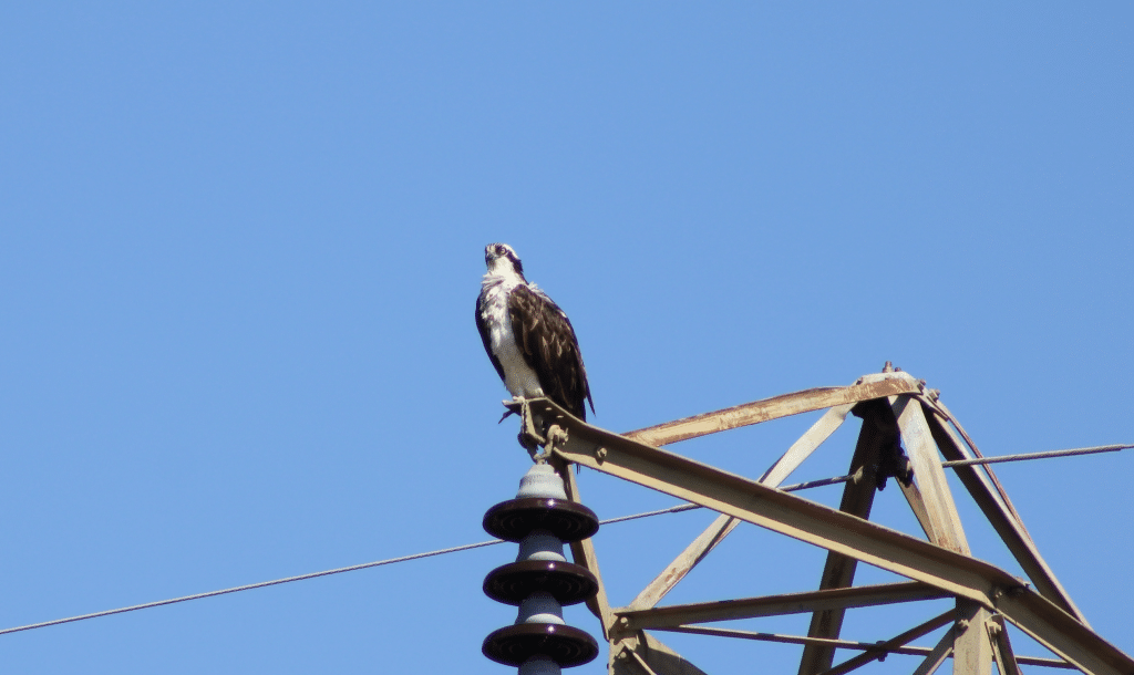 A large raptor often seen soaring over waterways hunting for fish. Sometimes referred to as a sea hawk, fish hawk or river hawk. Easily distinguishable from other birds of prey by its yellow eyes, white underside and dark streak on its head. Ospreys dive into the water talon-first up to 50 mph to catch their prey. They have nostrils that can close and a transparent eyelid, which makes them quite effective aquatic hunters. The tops of transmission towers, utility poles, nest platforms and dead trees are used by ospreys to build large nests in the spring and summer months. Nests are built out of materials such as large branches, sticks, grasses and moss.