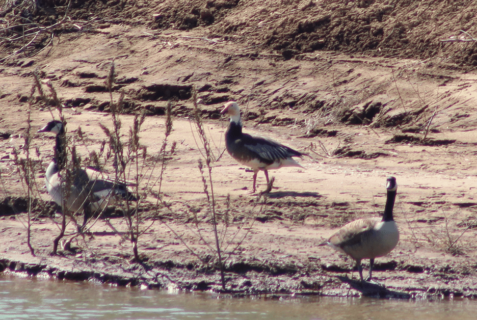 A native goose species found across North America, parts of Greenland and Eastern Russia. Since Ohio is included in the Mississippi Flyway region, populations of snow geese show up from mid-fall to the beginning of spring, but most frequently in the middle of winter. Their habitats include bodies of water, open fields and, in the summer, the Arctic tundra, where they breed. Snow geese have two color morphs: white morph and blue morph. Pictured above is a blue morph snow goose, which is distinguishable from the two Canada geese by its slaty gray body, white head, pink bill and pink feet. A dominant dark gene causes the change in their plumage.