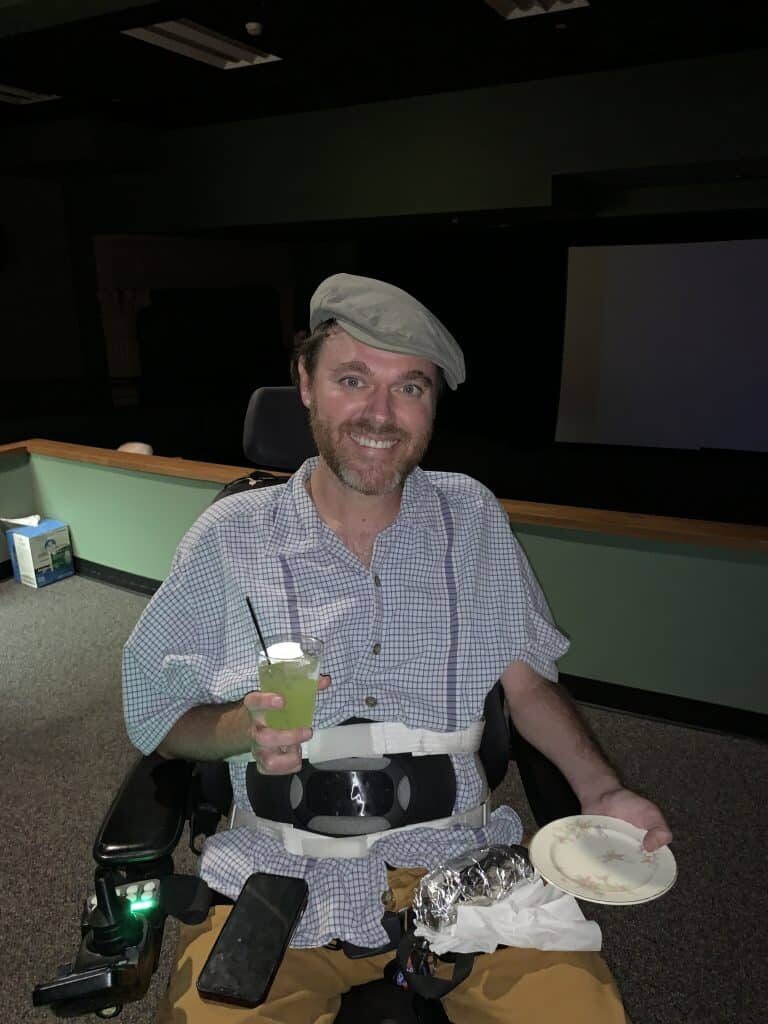 As you can see from the photo, I am holding an actual fancy plate at the theater, about to drink my lime green beverage, and have my baby burrito on my lap. I placed a napkin over myself and did not spill even a drop. Thanks to my neighbor Carol for taking the photo.