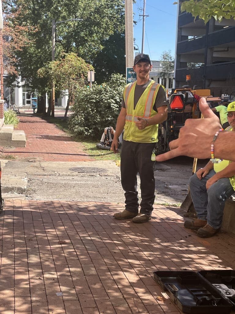 Pictured are contractors and sidewalk maintenance crews from McKee Paving, hired by the City of Athens. The guy pictured is wearing a reflective vest and giving me a thumbs up while another is throwing up a shaka sign. On Oct. 3, weeks after our City Council demands, they were out, on my birthday no less, grinding down Uptown curb cuts so they are level with the street, as well as fixing sidewalk potholes. Sometimes complaining loudly and with power works!