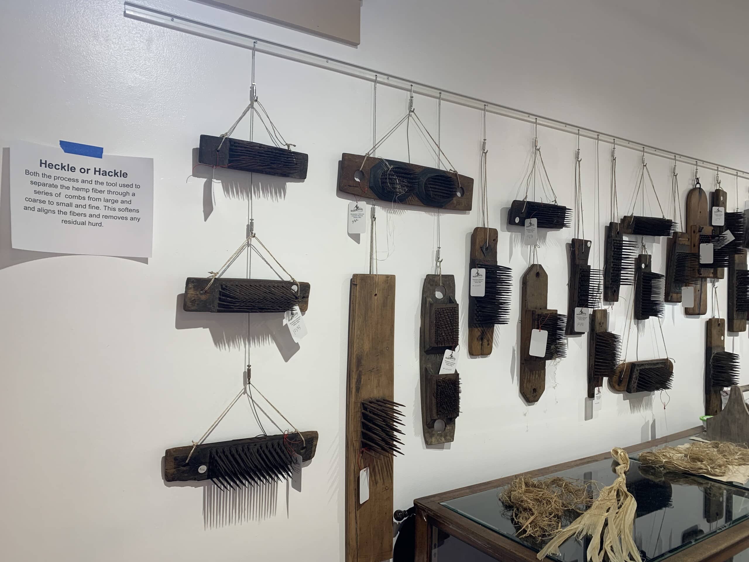 True to its title, the exhibit is made up of historical photos and paintings, physical artifacts used in the processing and storing of hemp and its seeds, and examples of hemp rope, cloth and clothing. A clockwise walk around the room takes patrons on that chronological journey, providing historical context and information about how specific tools were used throughout.