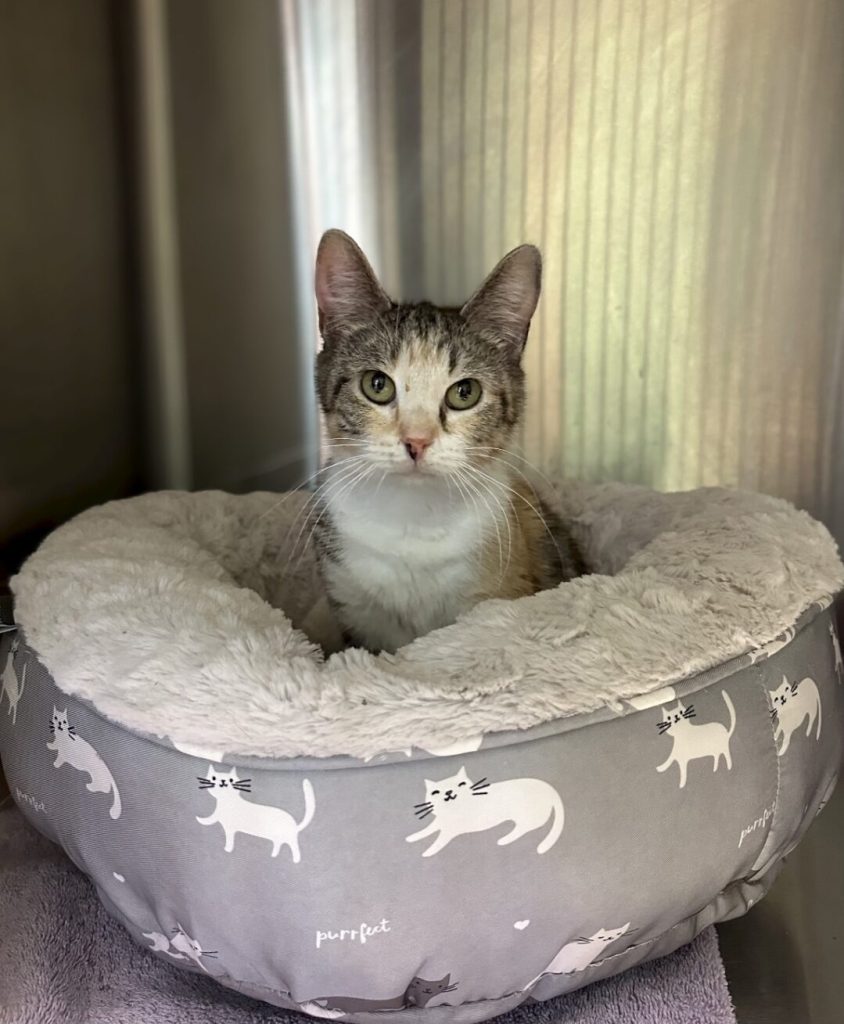 Cutie Pie is a 2-year-old caliby (calico-tabby) sweetheart with a mellow spirit and a heart full of love. She’s the kind of kitty who makes herself right at home—especially if there’s a big, plush bed involved!