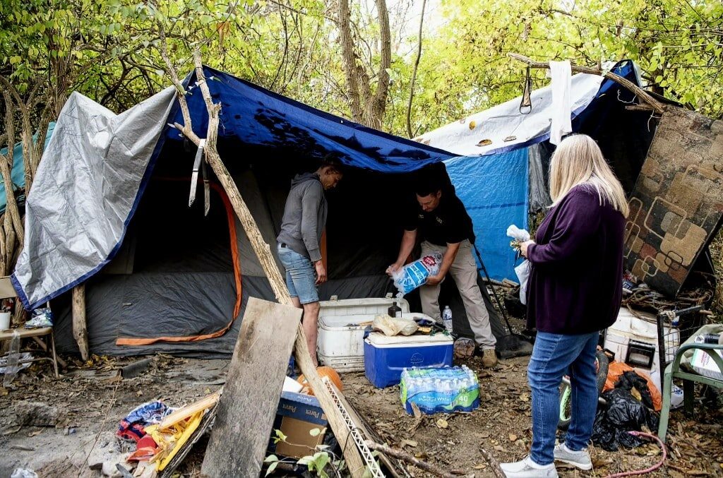Joanna Denny, embedded social worker with the Ross County Sheriff’s Office surveys an encampment with a Ross County deputy as they connect with residents and assess needs.