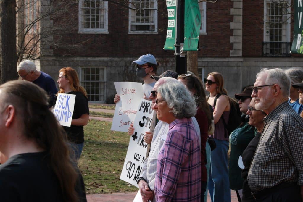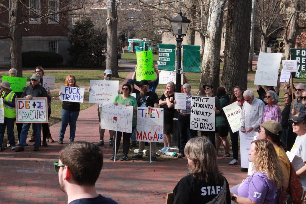 The protest began a little after 4 p.m. with demonstrators chanting phrases such as “O-U, do not comply, we are keeping D-E-I,” and “The people united, will never be divided.”