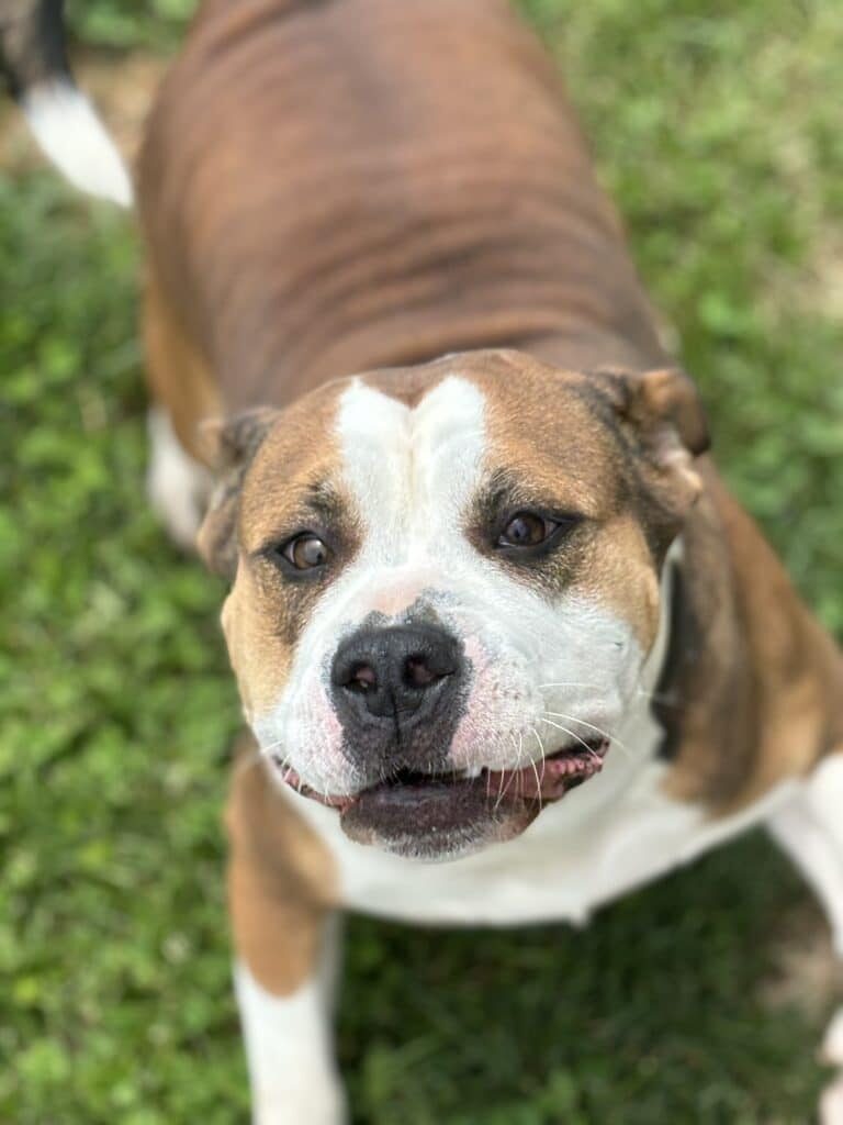 Shelter staff and volunteers adoringly refer to Hope as “portly,” “a whale,” and a “hippo.” Sure, she has some pounds to lose, but she is just the loveliest, stocky lady we know. Hope appears to be a 1- 2 year old english bulldog mix and she has the back rolls to prove it.