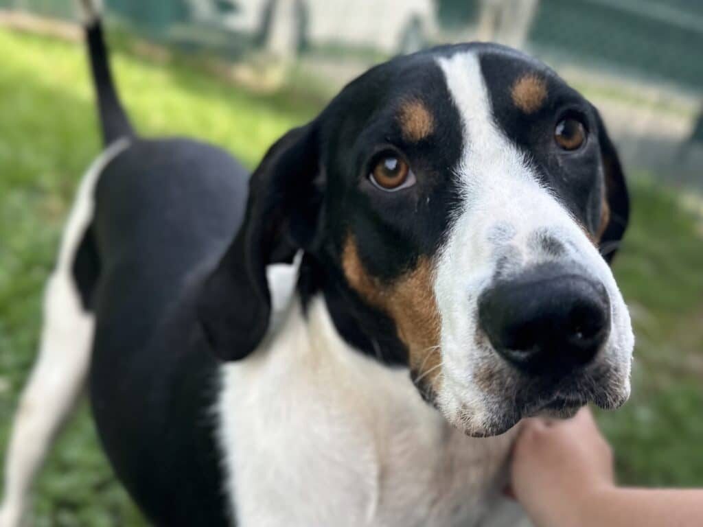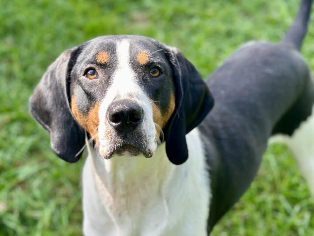 Links is an approximately 1-year old Coonhound and he is all personality. He is in what you might call the “toddler years” where he will occasionally throw tantrums (hello scream bark) if he doesn’t have your full attention or snag a stray blanket or toy as he is walking by just because he can. Mostly Links is learning that affection is not in short supply and that helps him feel safe and secure. When you give him pets and love, he leans in tight, closes his eyes, and sighs with contentment.