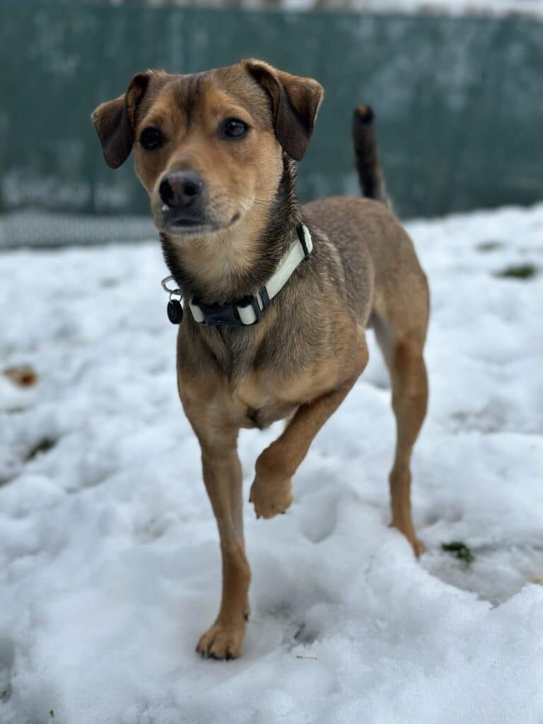 Despite this trauma, Skippy has blossomed in the shelter. He has especially perked up with the recent snow –– he loves it! He enjoys the company of other dogs, is an active member of playgroup, and will jump up on you for attention. We can’t figure out what kind of mix this little guy is, but he is adorable. At just 19 pounds, he looks like someone shrunk a retriever into a small dog.
