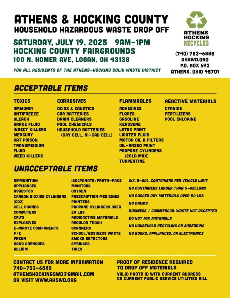 Household hazardous waste, such as paint, cleaning chemicals and batteries, are typically collected at the Athens-Hocking Solid Waste Districts annual household hazardous waste collection day, which is being held this upcoming Saturday, July 19, at the Hocking County Fairgrounds.