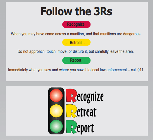 Getting rid of these dangerous items, be it explosives or tear gas, is best left in the hands of trained professionals. The most widely spread guidance for dealing with these materials is to follow the three R’s: recognize the item, retreat from it, and report it.