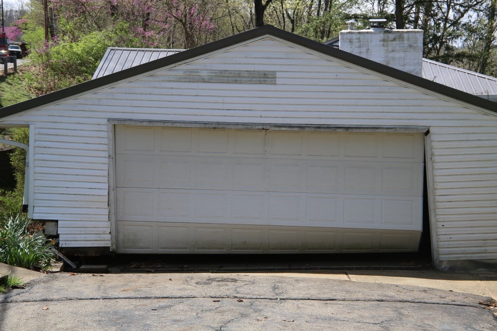 April 10 update: The garage of the house at Joneswood Drive has fully collapsed. The weight has now shifted to the other side of the house causing a slight lean.
