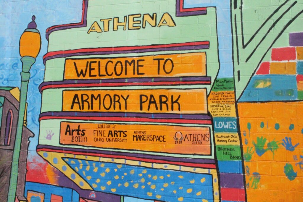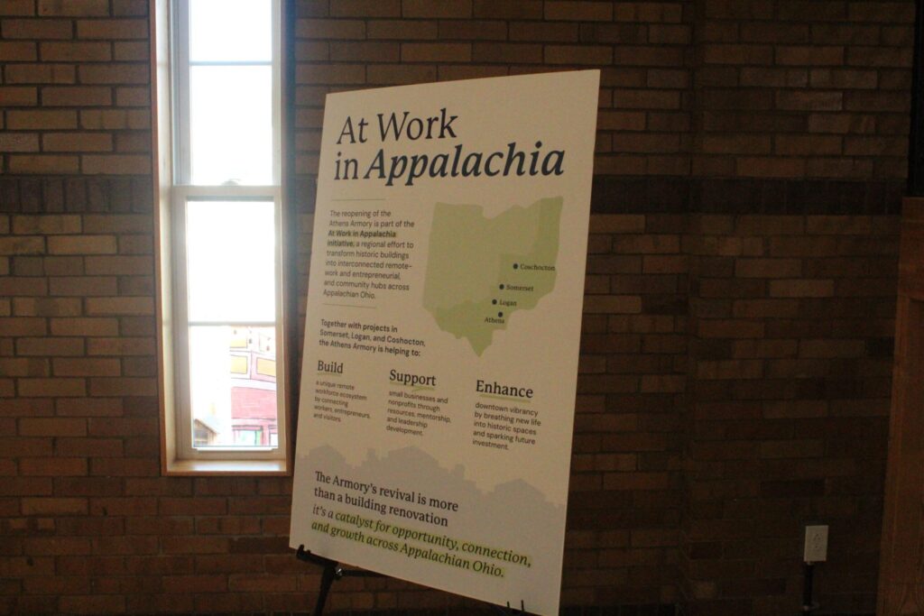 ATHENS, Ohio –– The Athens Armory reopened its doors to the community Tuesday, Sept. 30 at 1 Armory Street, Athens. Locals came together and toured the newly renovated space over drinks and snacks, exploring the building that will home BlueDot Co-working & Event Space and the Athens County Foundation.