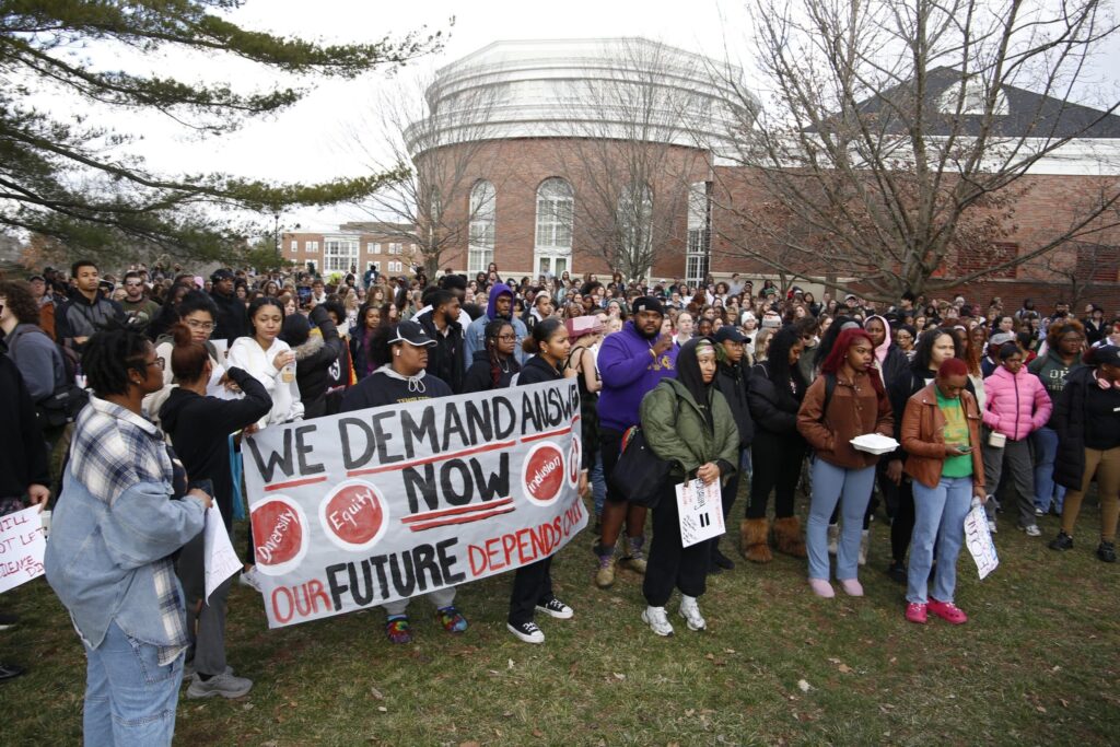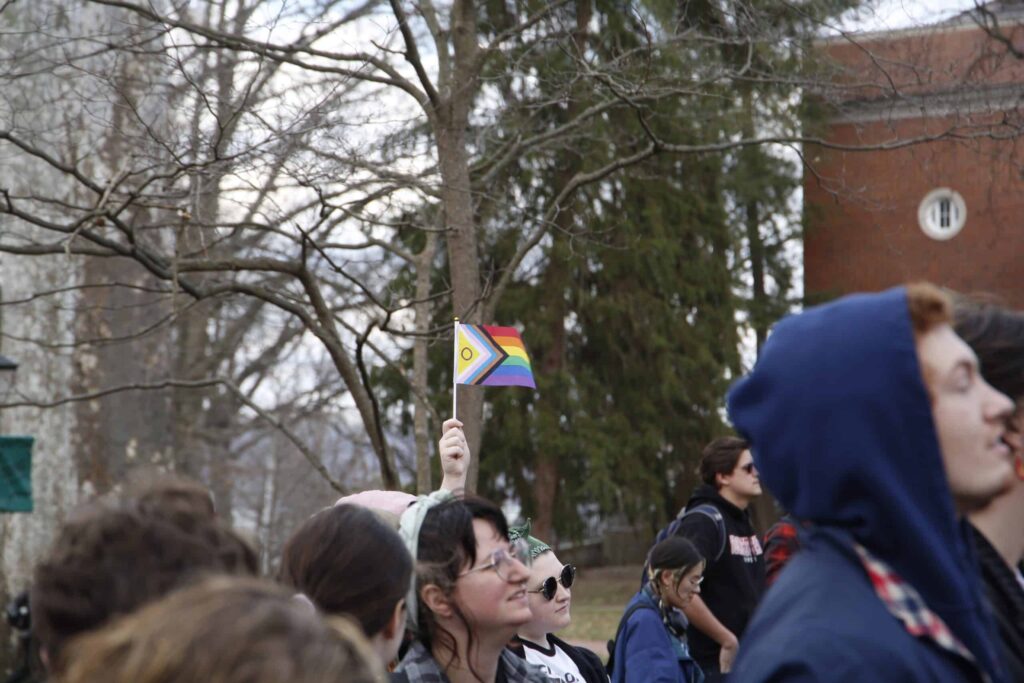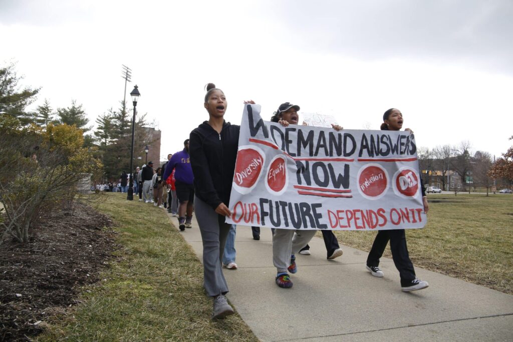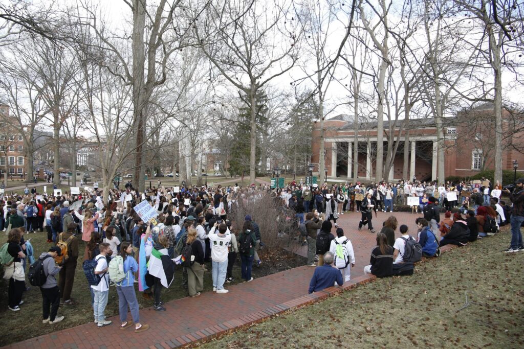 The group then marched to uptown chanting “Hey hey, ho ho, Senate Bill 1 has got to go” and “Equal rights, equal say, DEI is here to stay.” The protesters grew in number as they arrived on College Green and gathered in front of Cutler Hall.