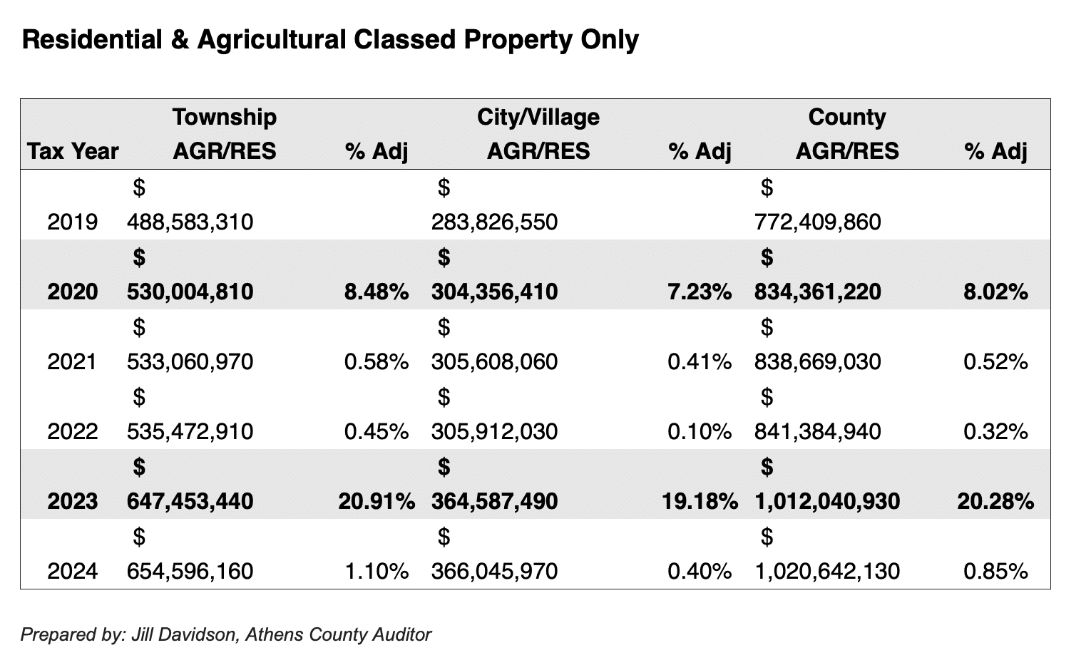 Davidson called for a triennial reassessment of Athens in 2023 which saw a “13.65% increase in assessed value, with residential and agricultural property values increasing by more than 20% — far exceeding the growth of other property classes.”