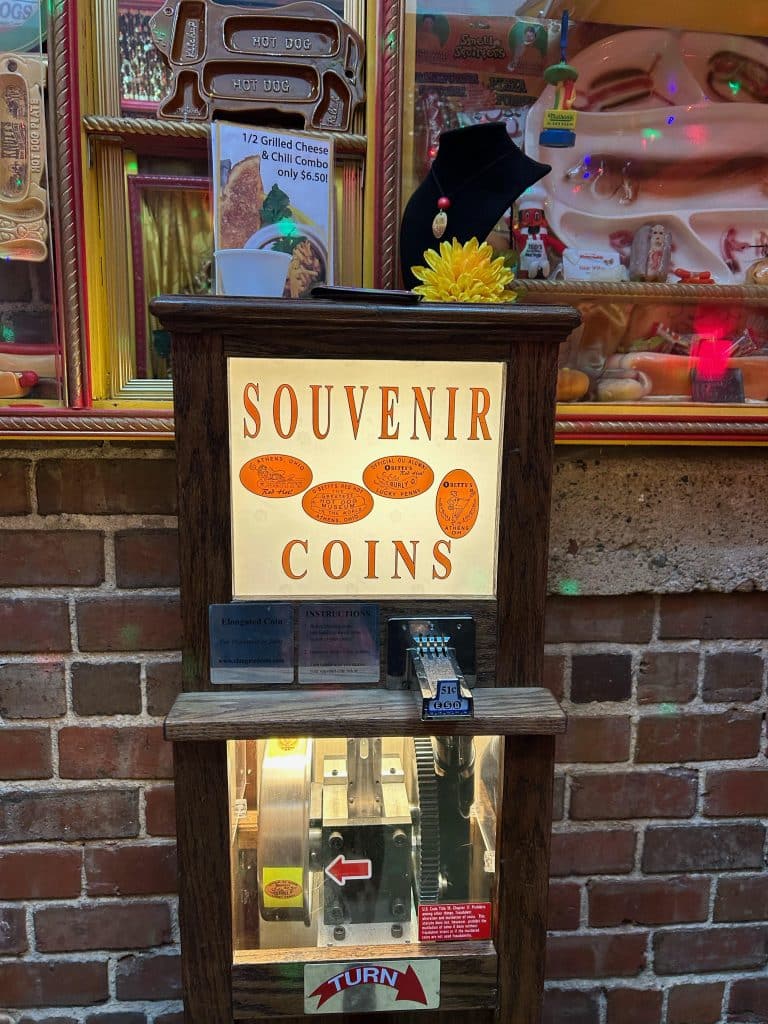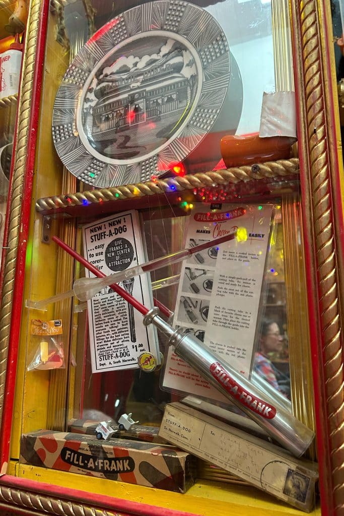 The intimate indoor seating area includes a hot dog museum (where I learned that Fill-A-Frank and Stuff-A-Dog were rival hot-dog coring and filling devices a few decades ago), spinning disco balls, a souvenir coin machine, and photos of classic burlesque performers. A few additional tables are available outside. From 11 a.m. to 9 p.m. orders are placed at the counter inside, and from 9 p.m. to 3 a.m. take-out orders can be placed at an exterior window.