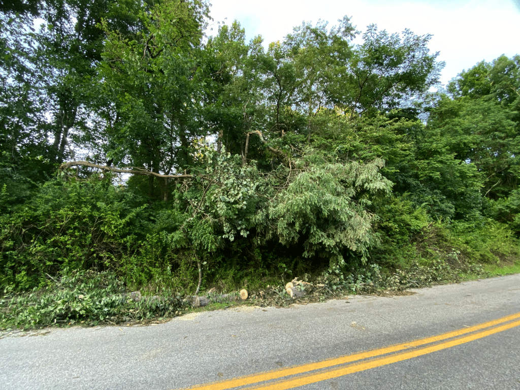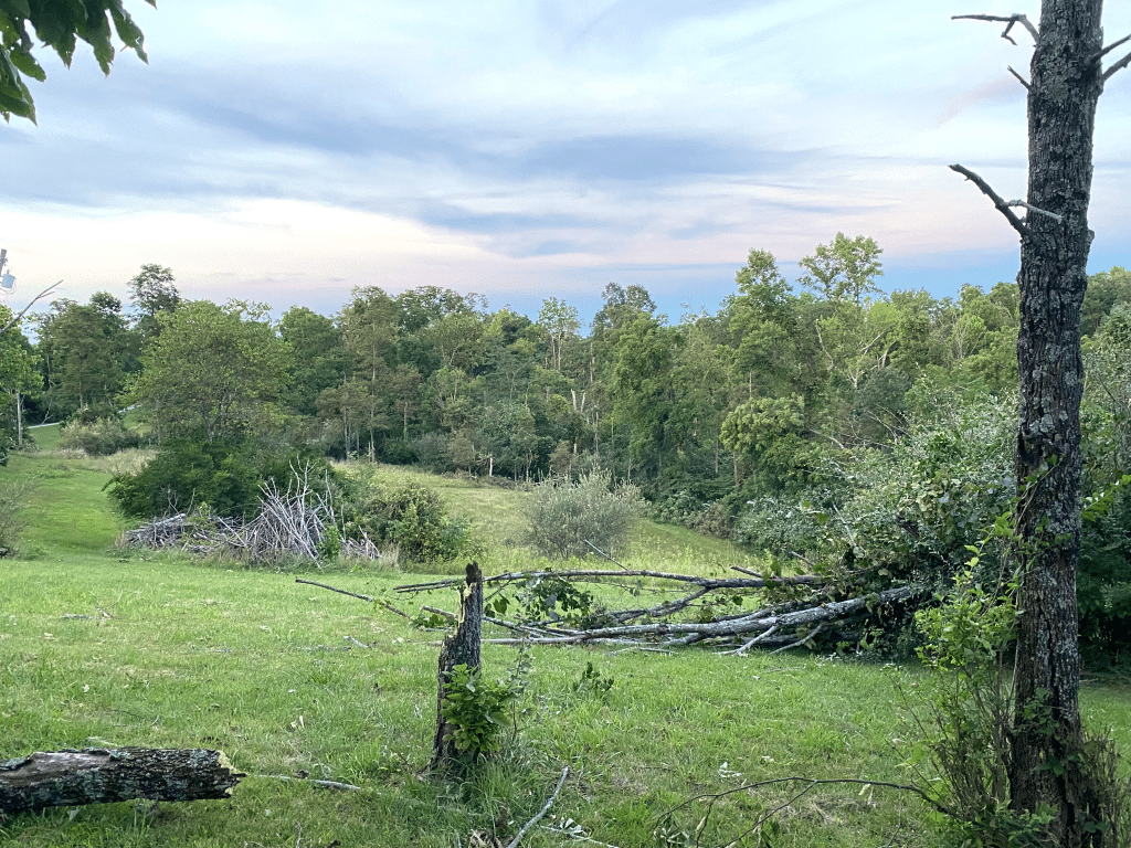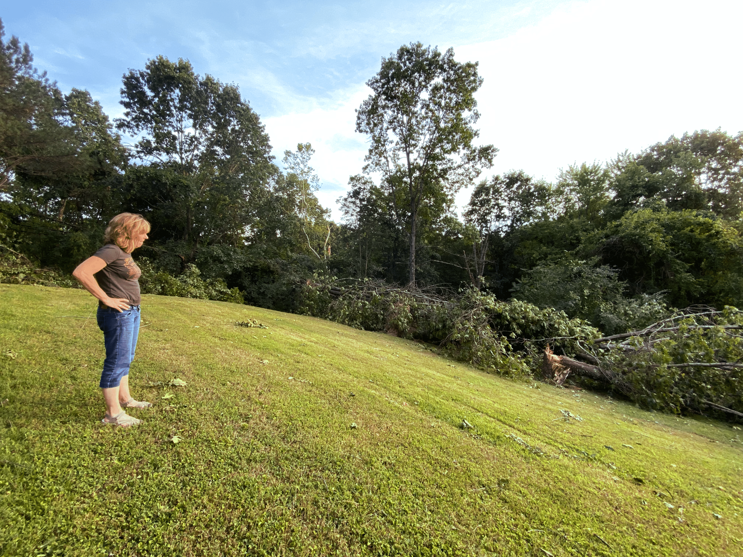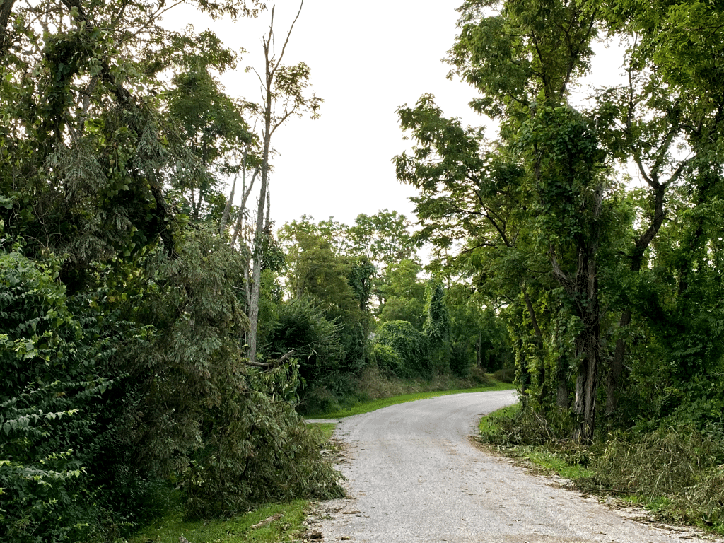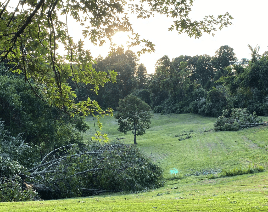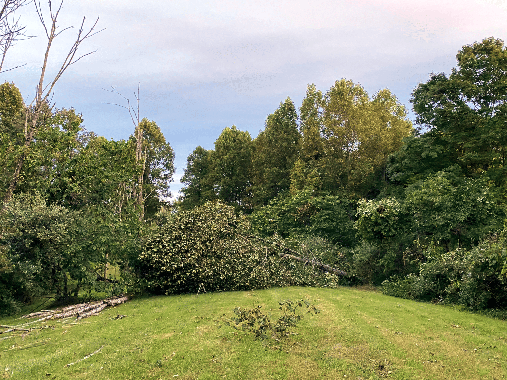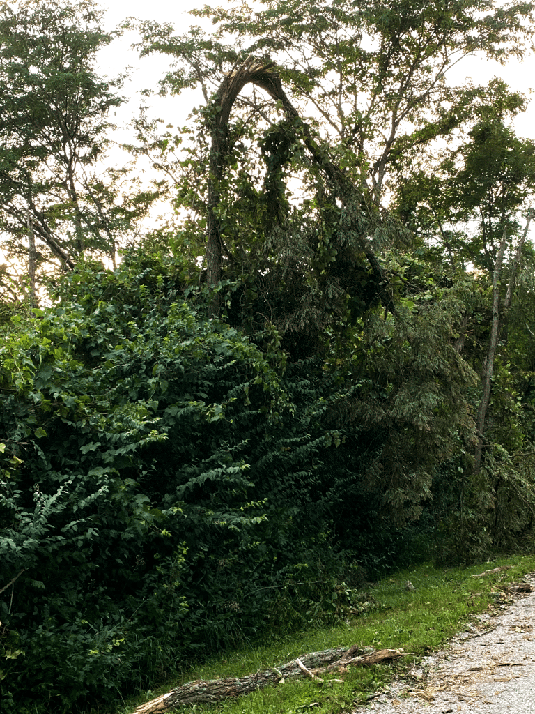 The twister snapped oak and walnut trees at their bases, as well as softer woods like pine and tulip poplar. The only damage to the Berryman’s home, however, was a cracked deck post — most likely struck by their grill, which wound up near the front porch.