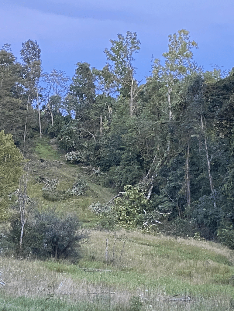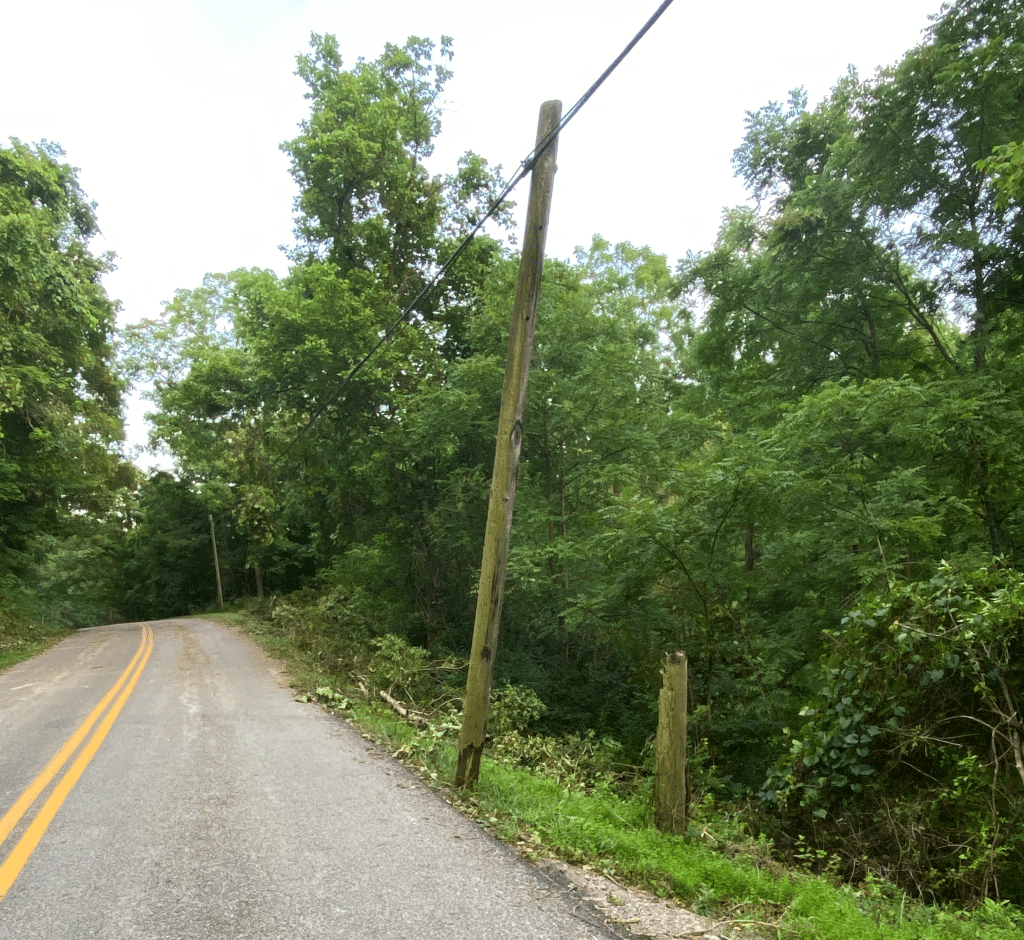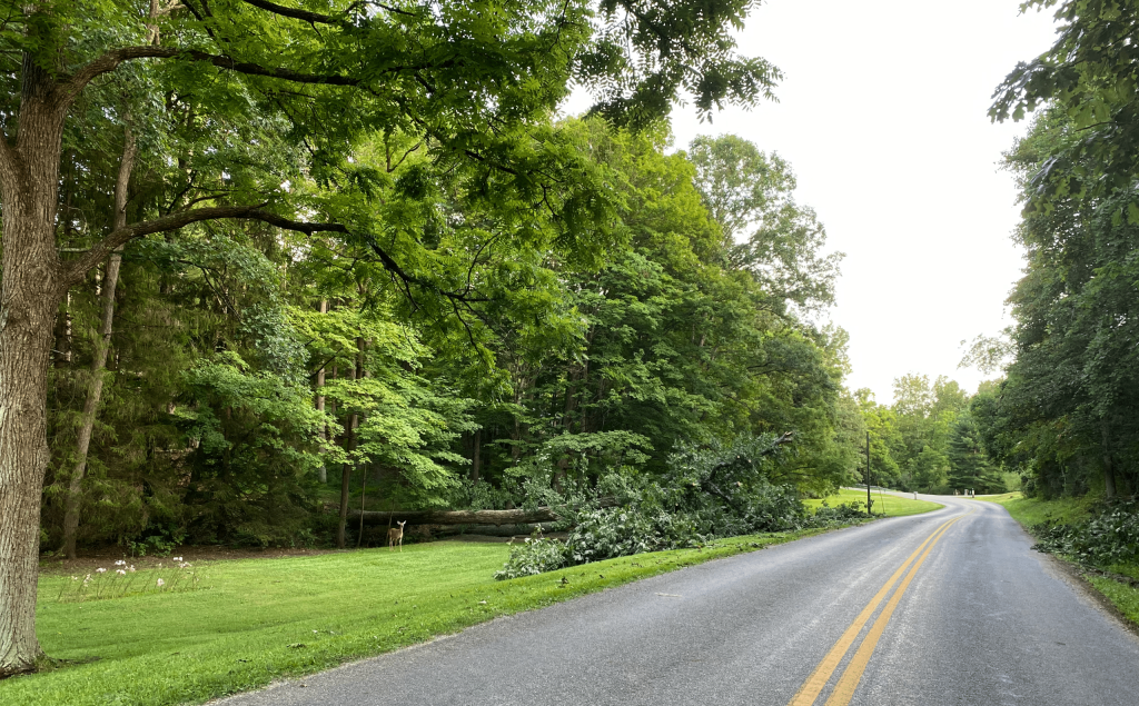 Heavy forest damage was evident on Long Run Road. A chestnut oak was uprooted; a little farther along, a utility pole had snapped about four feet from the ground but remained upright on its new bottom just off the edge of the road.